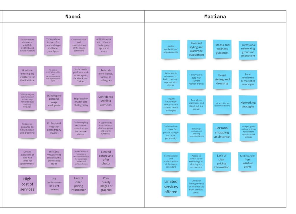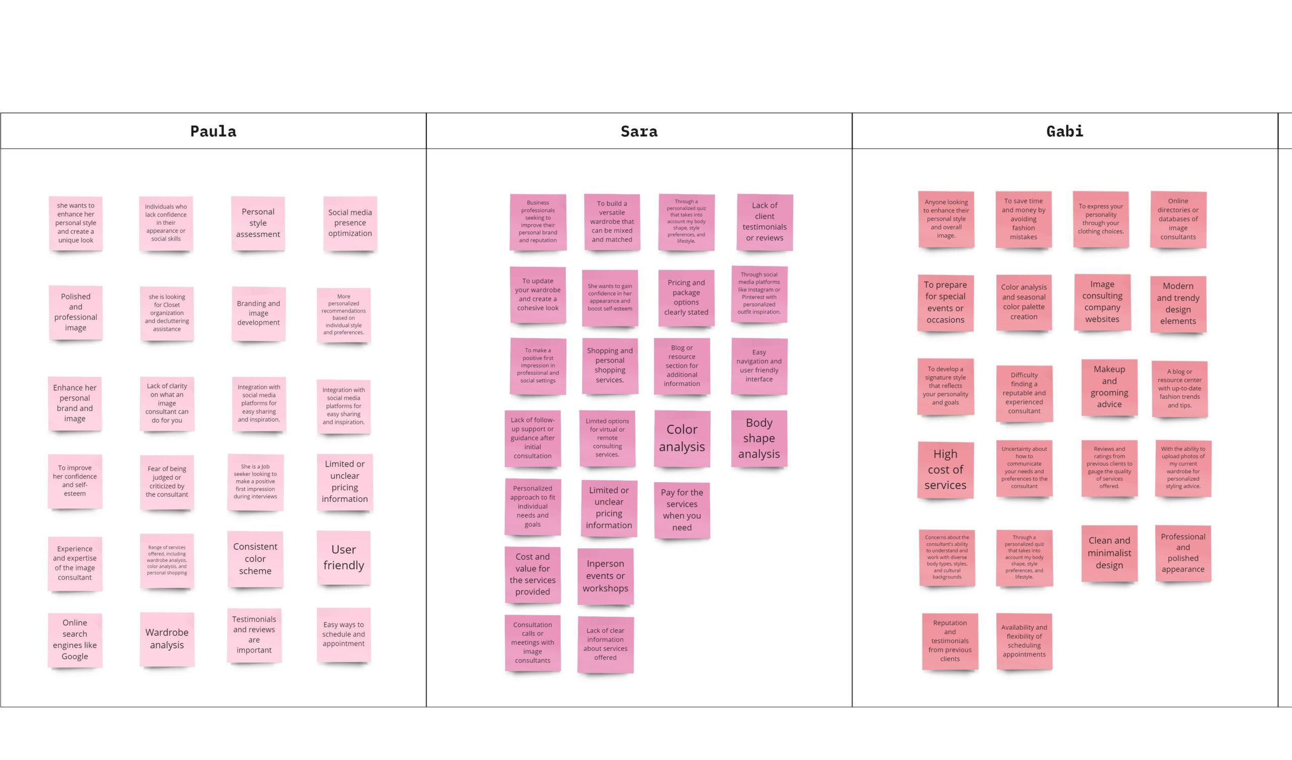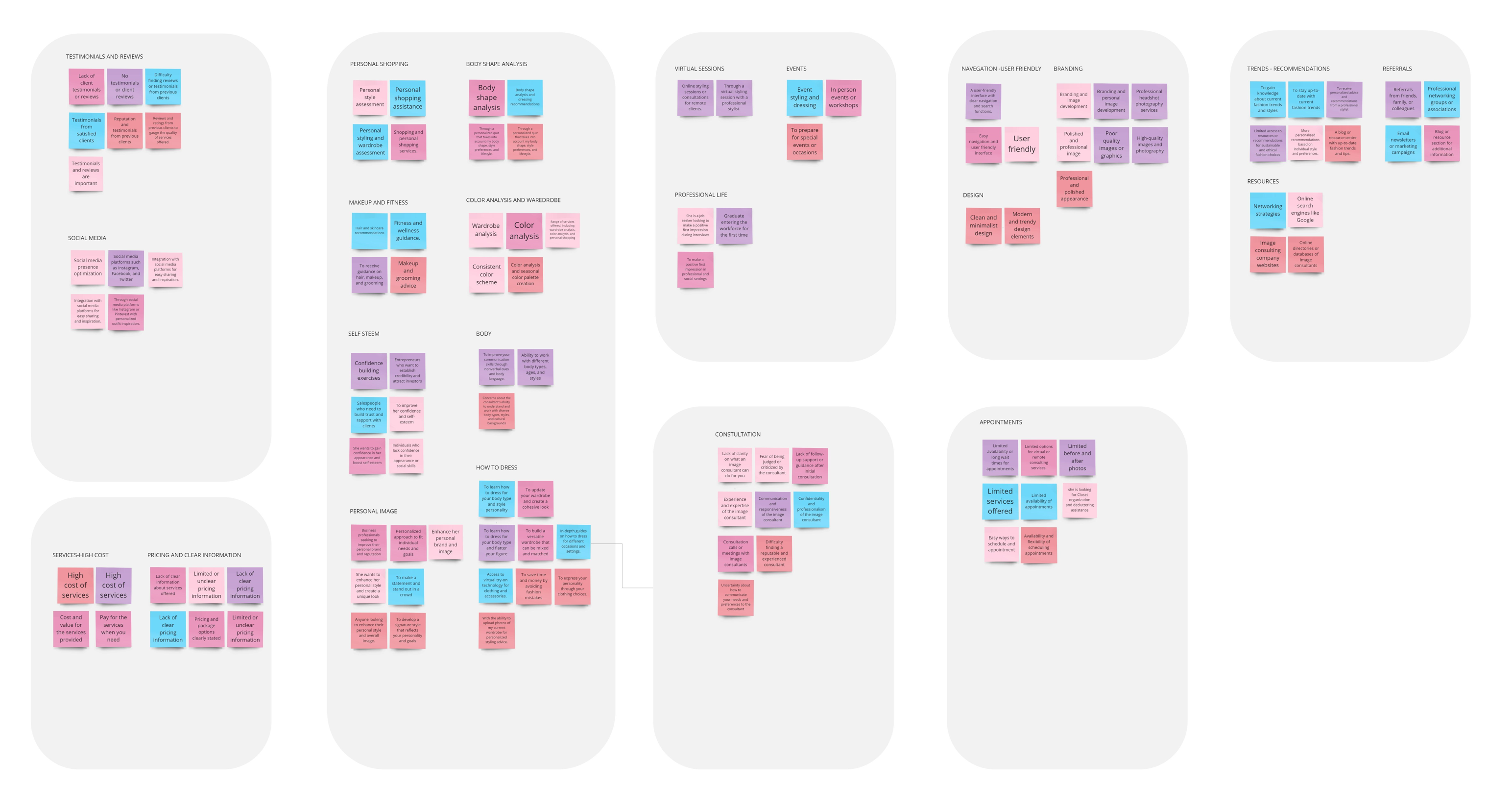 After conducting interviews with 5 participants and collecting feedback from 13 surveys, I gathered valuable insights regarding image consulting services. By carefully listening to their thoughts, feelings, and pain points, I complied the information and identified recurring patterns to gain a deeper understanding of my target audience