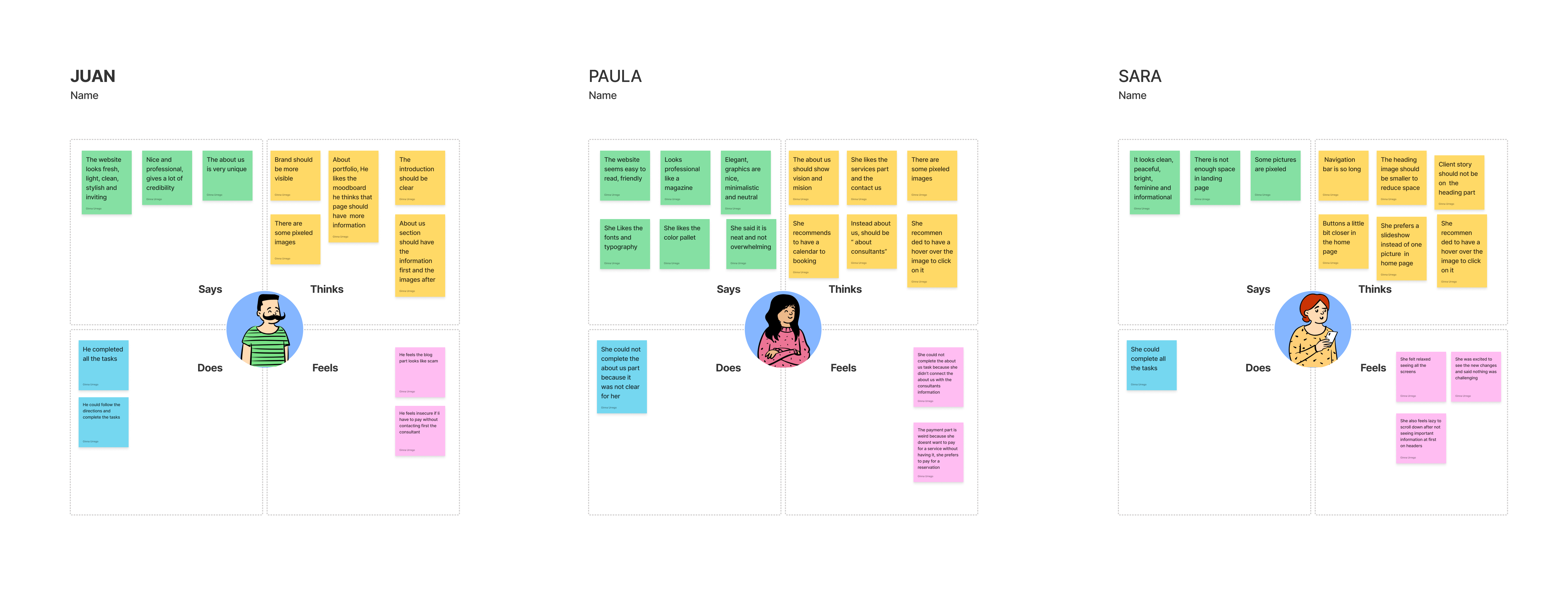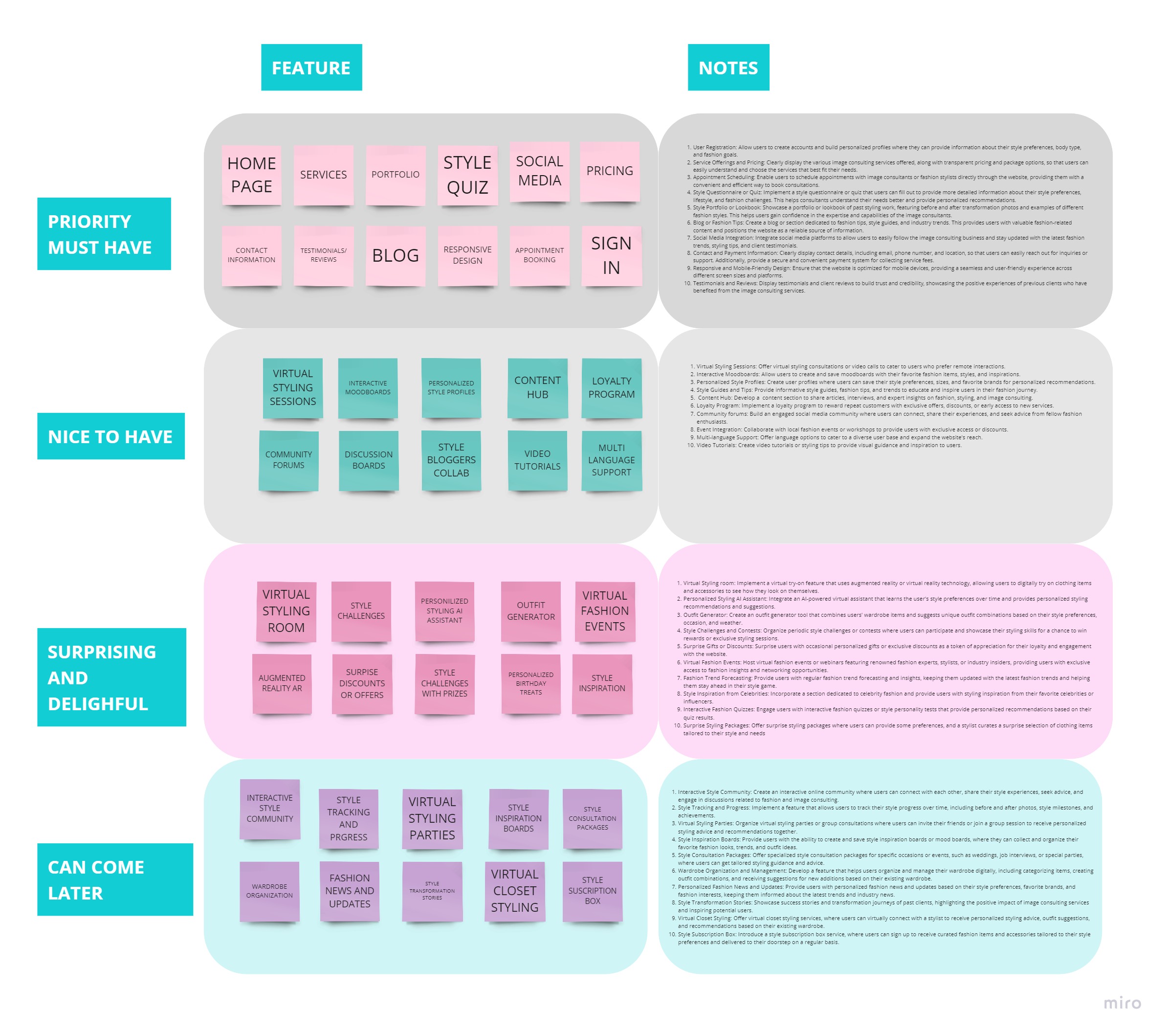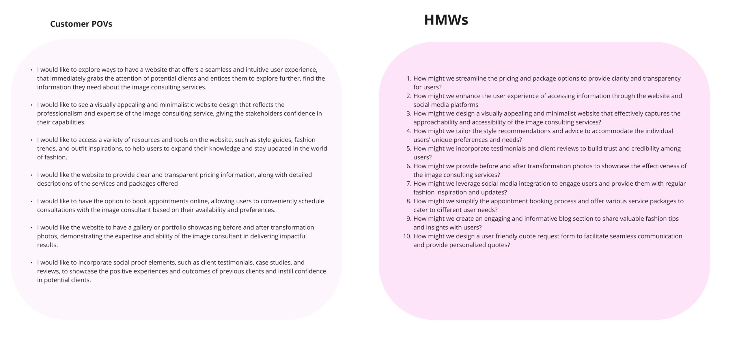 After conducting interviews with 5 participants and collecting feedback from 13 surveys, I gathered valuable insights regarding image consulting services. By carefully listening to their thoughts, feelings, and pain points, I complied the information and identified recurring patterns to gain a deeper understanding of my target audience