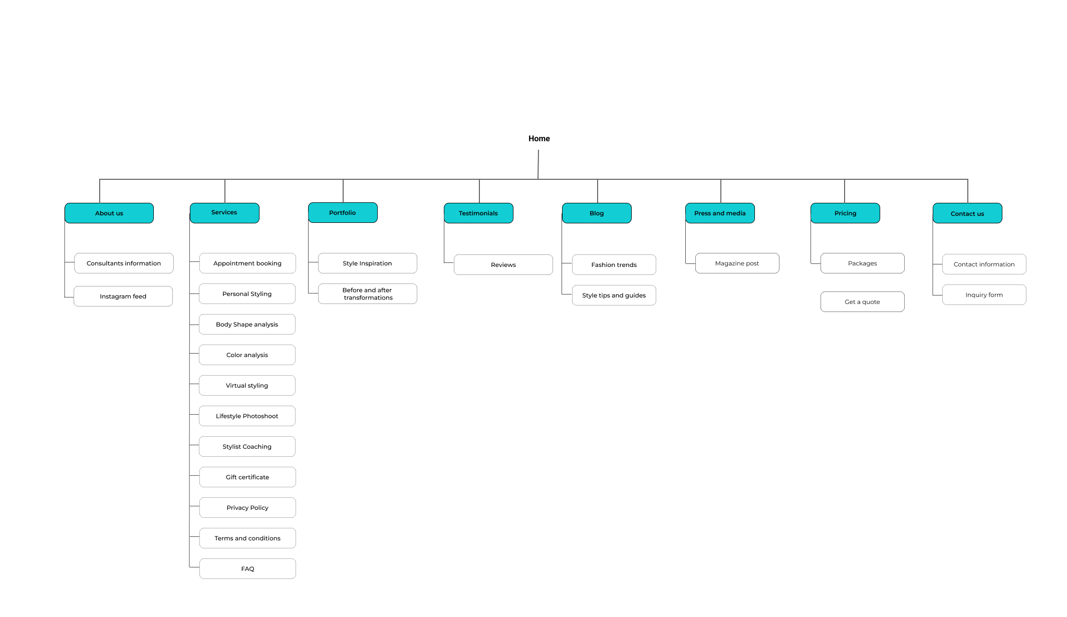 A site map for BloomUp’s image consulting website is a hierarchical representation that outlines the structure and organization of its web pages. This visual tool provides an overview of how content is arranged, showcasing main navigation categories such as Home, Services, Portfolio, About Us, and Contact. Each category branches into subpages, offering users a clear path to navigate through the website’s offerings and information. By visually depicting the site’s layout, the site map helps ensure intuitive user navigation and aids in efficient content creation and management, ultimately contributing to a user-friendly and organized online experience for visitors to the BloomUp website.