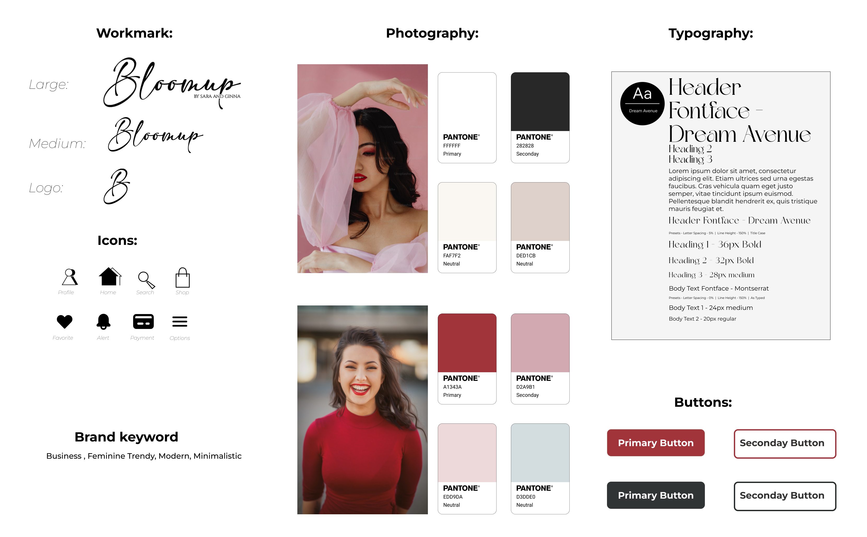 Branding for Bloomup, the image consulting firm, encapsulates a harmonious blend of elegance and approachability. The brand’s visual identity radiates through soft yet sophisticated color palette, encompassing shades of grey, black, and white. This selection evokes a sense of modernity and professionalism while maintaining a warm and inviting ambiance. The logo, a graceful combination of sleek typography and subtle graphical elements, symbolizes the transformative nature of personal style enhancement. The brand’s voice and tone resonate with authenticity, offering a genuine connection to clients. In totality, Bloomup’s branding embodies the art of self-expression and the journey towards self-assured confidence.