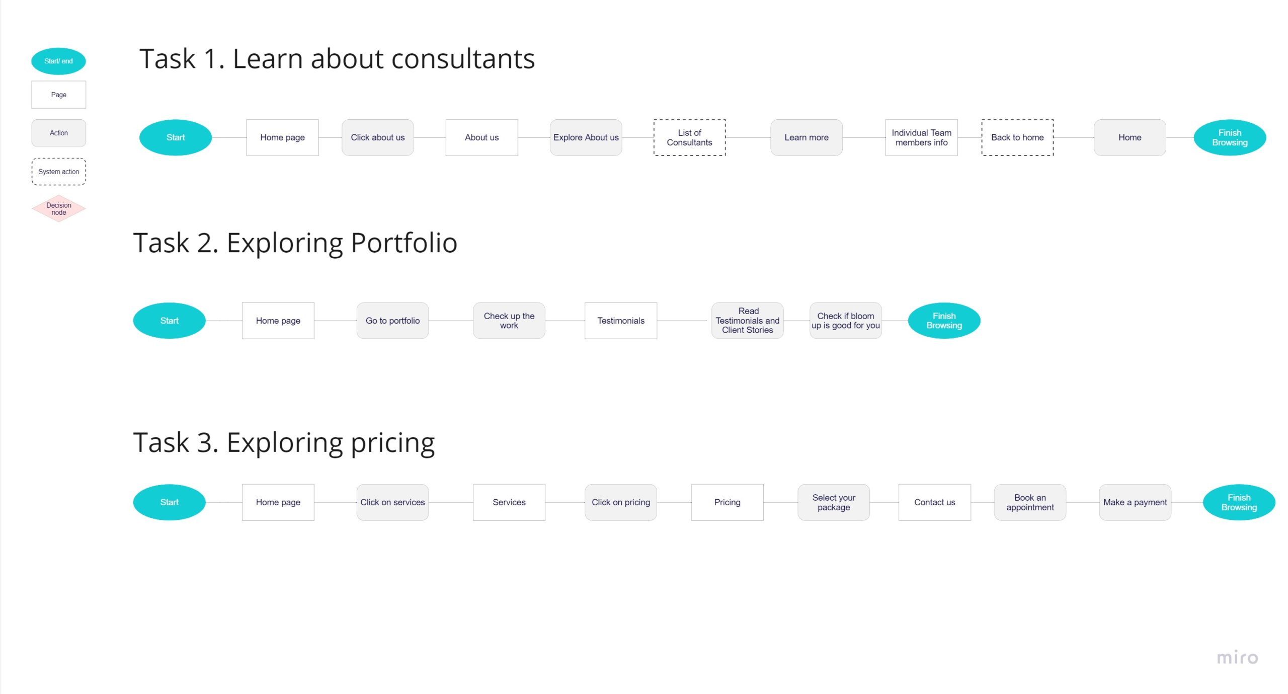 A task flow might illustrate the precise steps a user takes to book an appointment on the website, while a user flow could depict the entire experience from first encountering the website to successfully booking an appointment, encompassing their emotions and interactions along the way. Both these visual tools aid in designing intuitive and user-centered experiences.