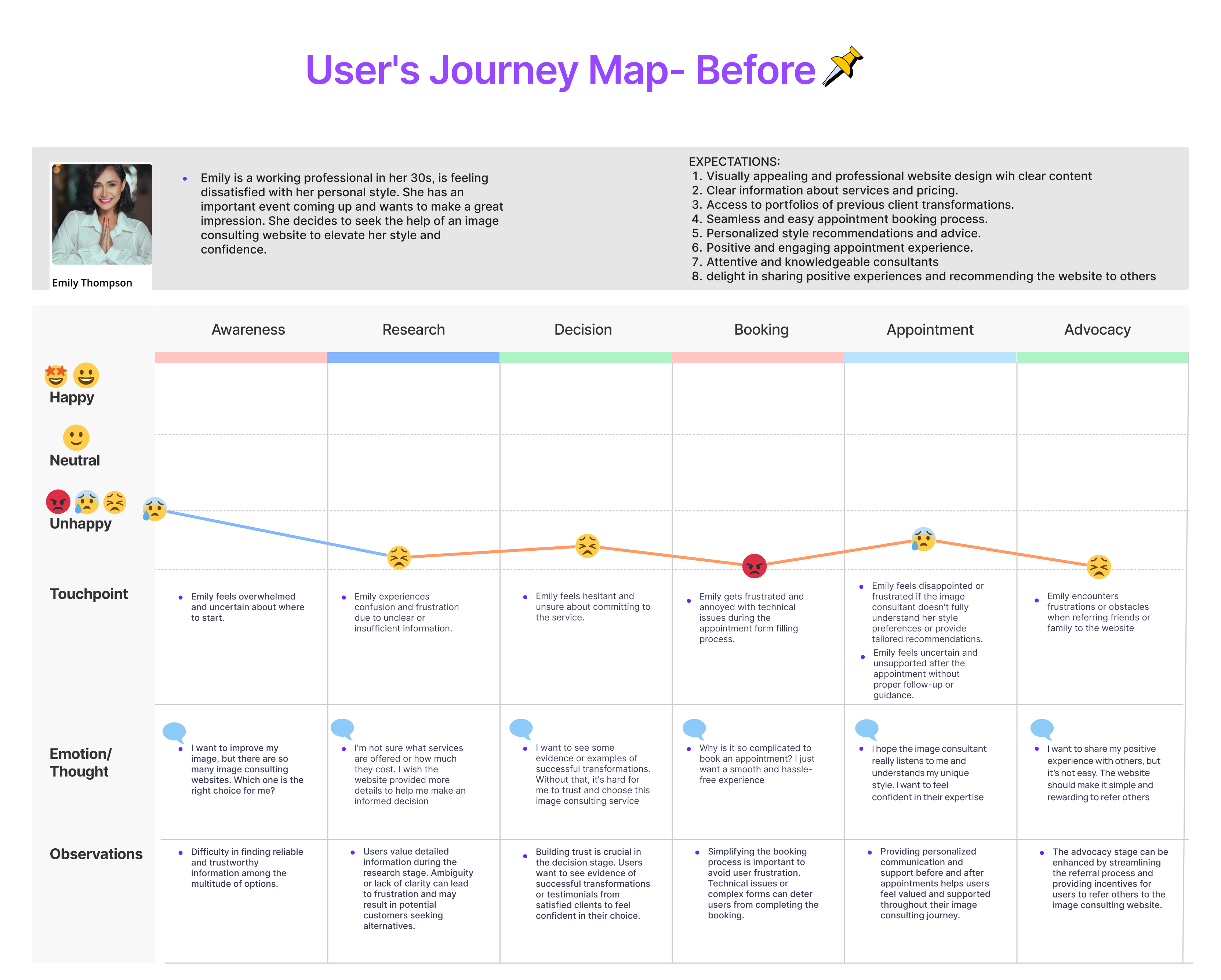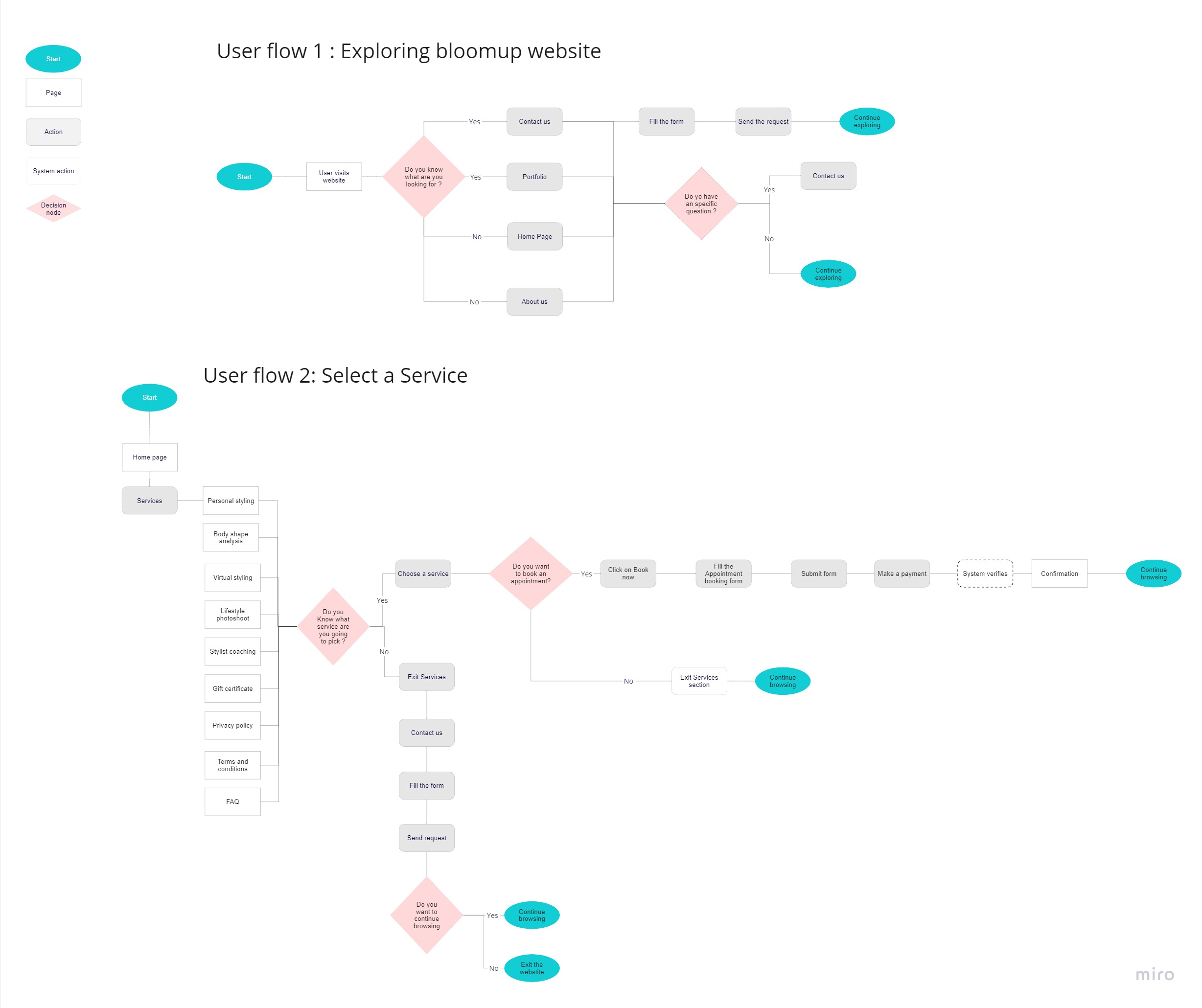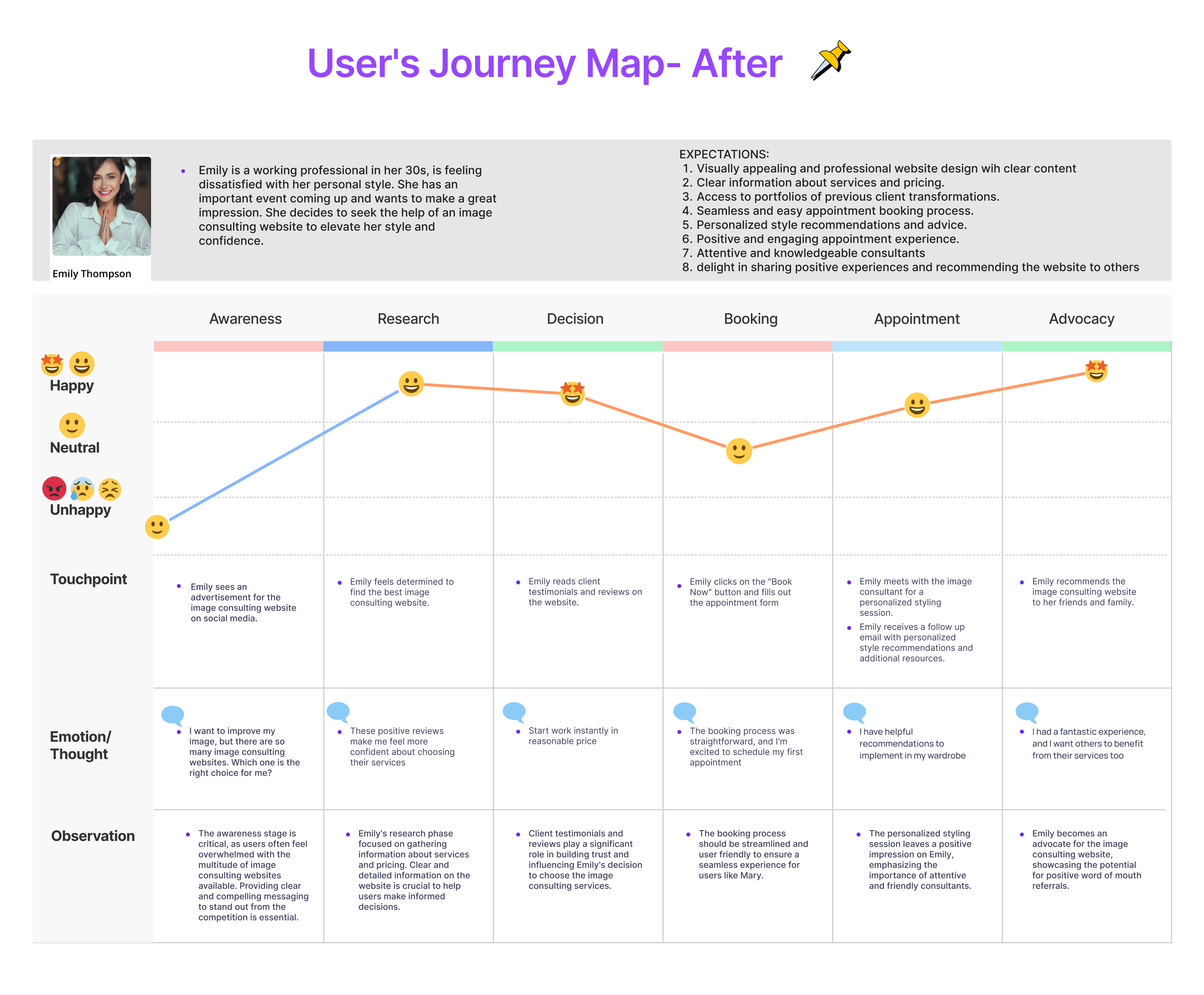 The function of a journey map, particularly in the context of Bloomup’s image consulting project, is to comprehensively illustrate the user’s entire experience from their initial encounter with the website to booking appointments. It offers a user-centric perspective, fostering empathy and understanding of user needs and challenges. By pinpointing pain points and uncovering opportunities for enhancement, the journey map guides the team in refining user interactions. This visualization fosters cross-functional alignment, aids iterative improvements, and serves as a communication tool for stakeholders. Ultimately, it empowers Bloomup’s team to create a seamless and empathetic user experience that aligns with the project’s goals and the users’ expectations.