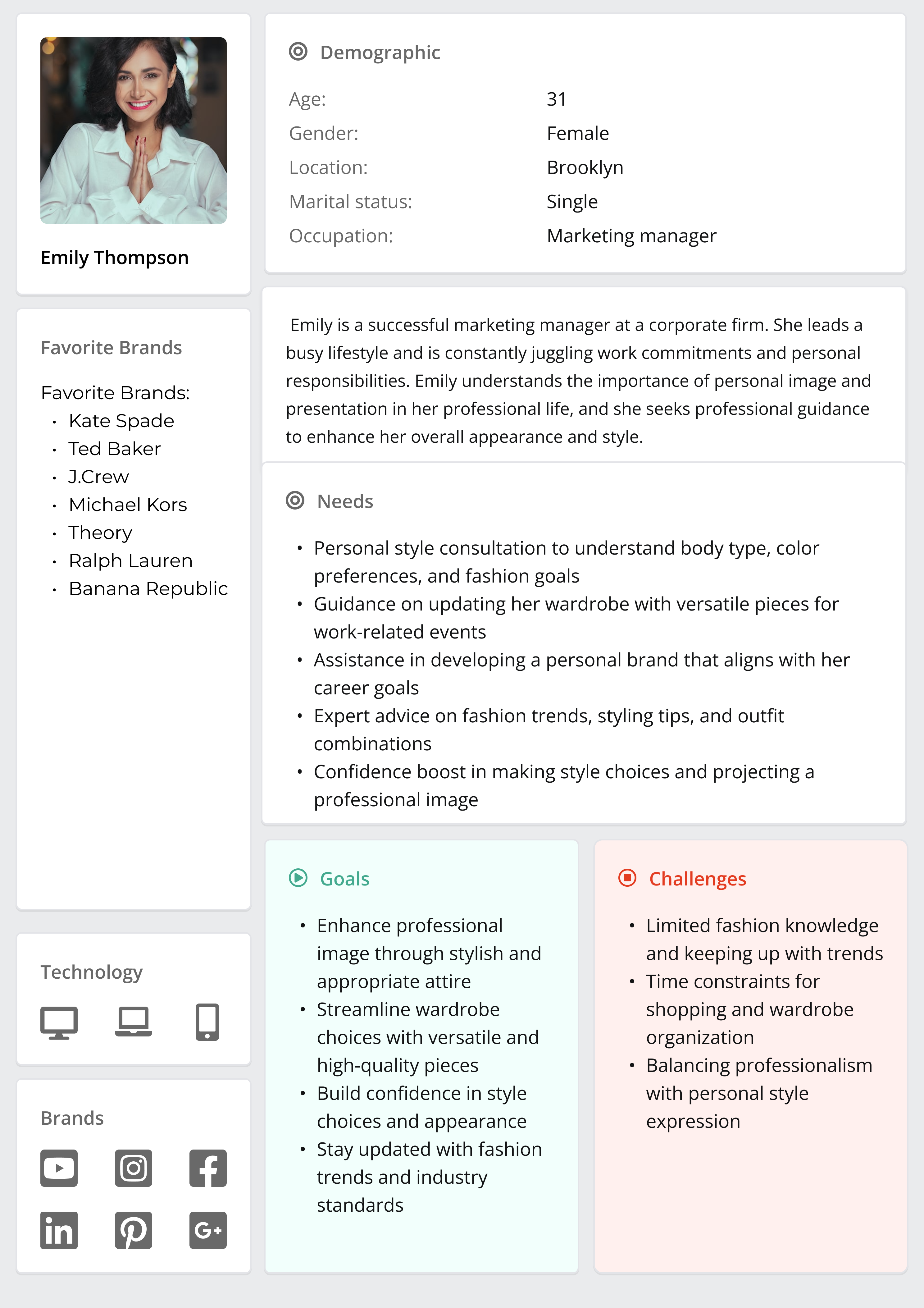 - They value engaging and visually appealing content, including client testimonials, before and after photos, and styling tips shared on platforms like Instagram, Facebook, and Pinterest.