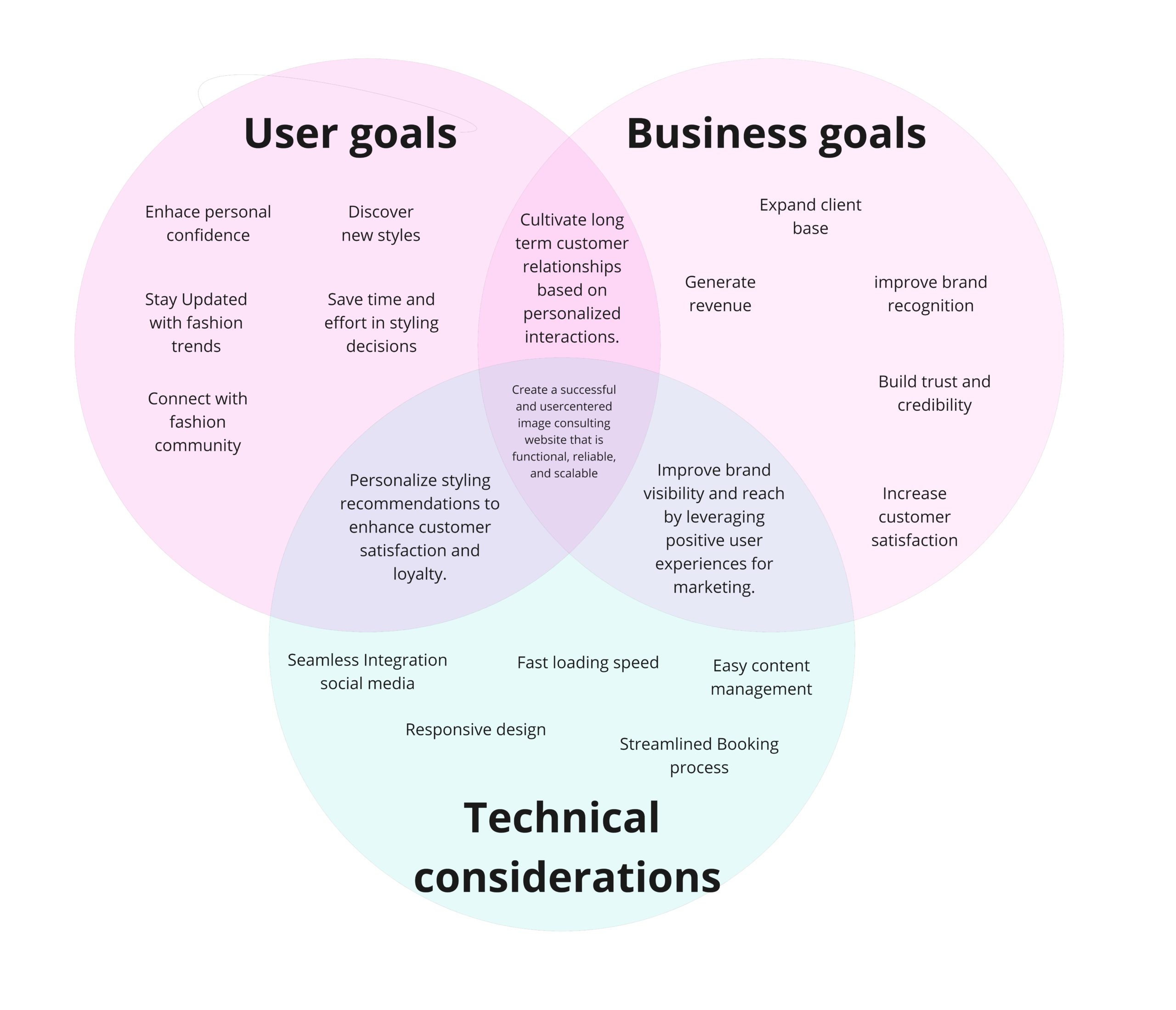 A Venn diagram is a visual representation that uses overlapping circles to depict the relationships between different sets of data. In the context of BloomUp’s image consulting project, a Venn diagram could illustrate the intersection of user goals, business objectives, and technical considerations. This depiction highlights the common ground where these aspects align, aiding in identifying priorities and guiding the design and development process. It offers a clear and concise way to showcase how these three dimensions interact, ensuring a well-balanced and effective approach that caters to both user needs and business goals.