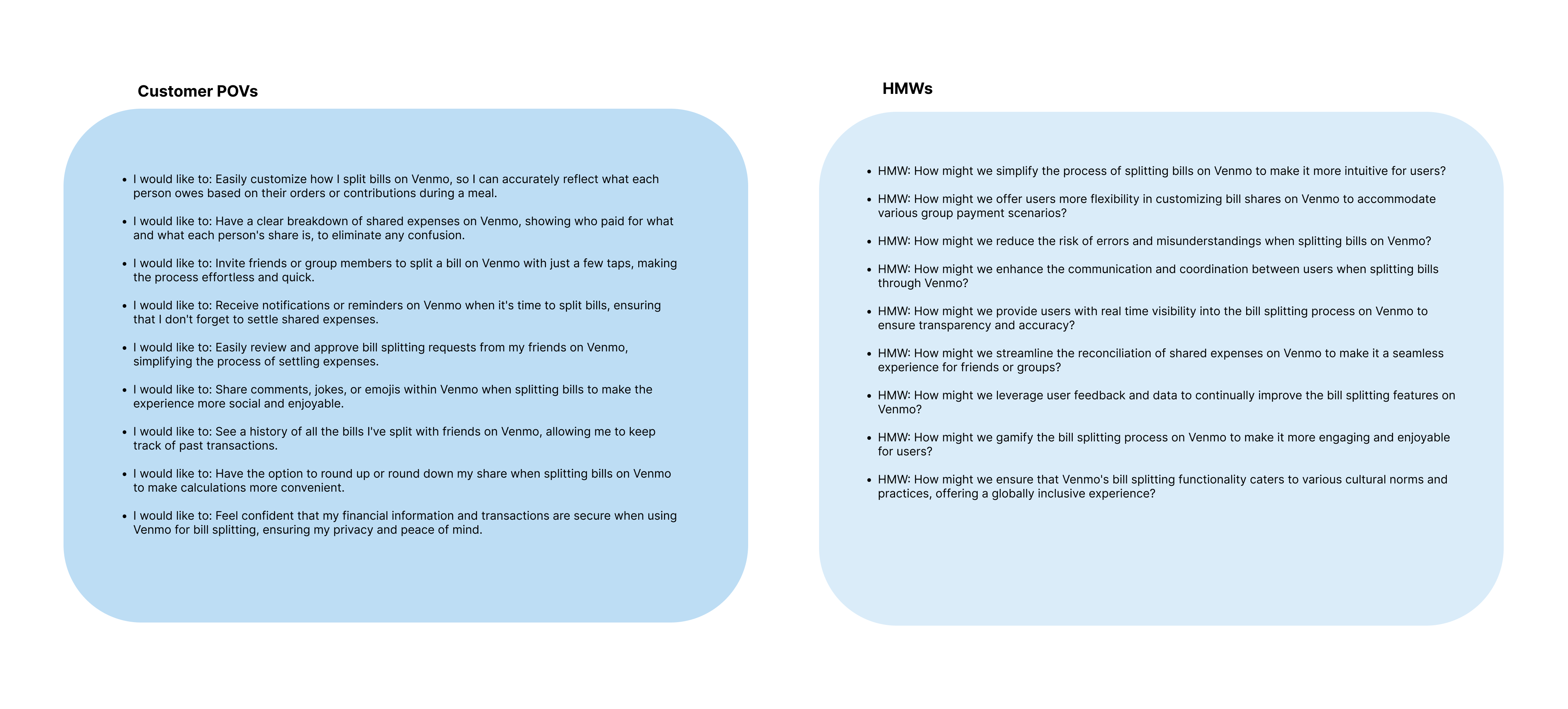 Another noteworthy discovery in our research was that all users believed a bill splitting feature would be beneficial to some extent. They highlighted that such a feature would save them time and streamline the payment process, particularly when they were managing group payments. Users often resort to manual requests to individuals when they owe different amounts, as Venmo currently lacks the functionality to manually split total costs among users