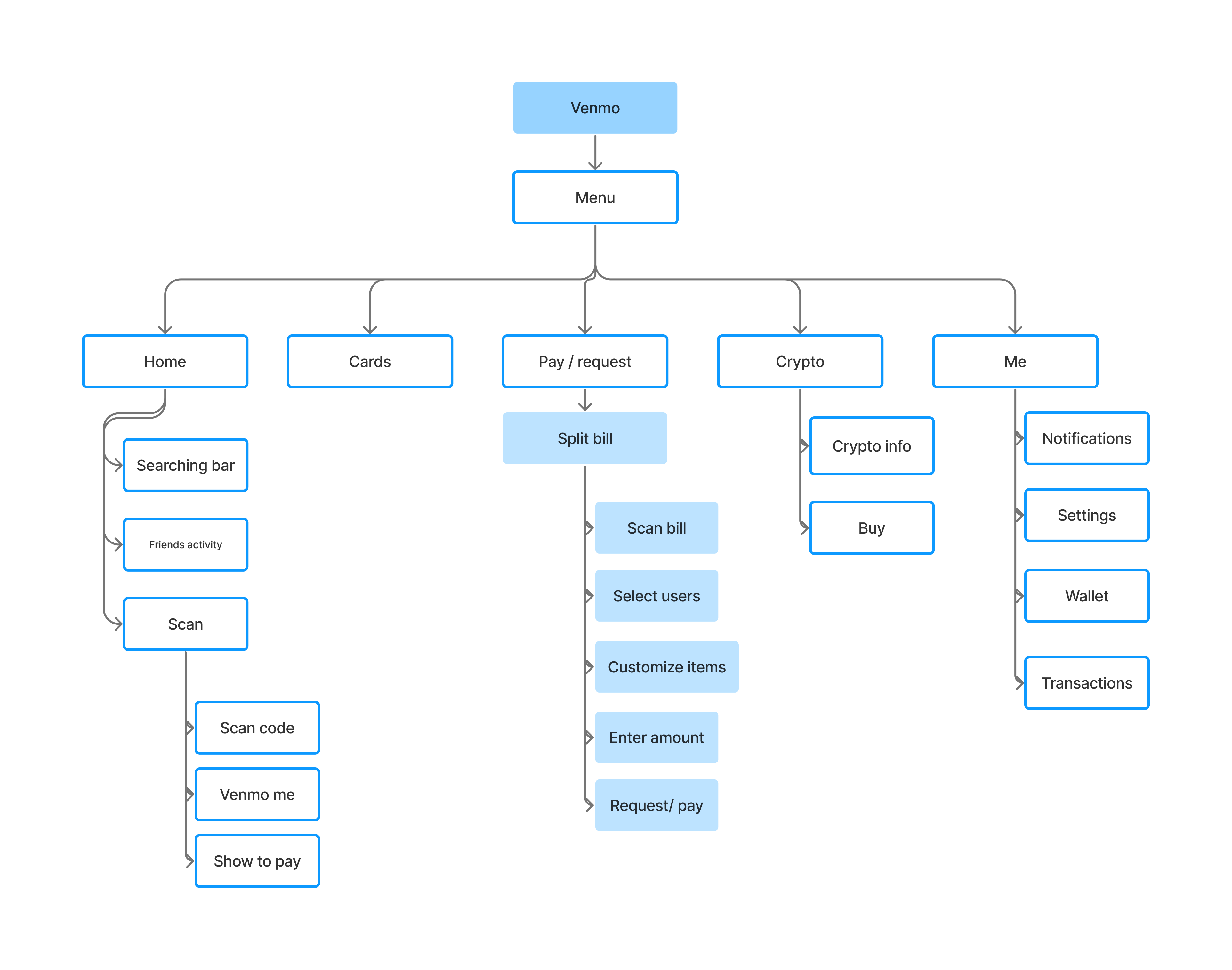 Venmo’s site map is a visual representation of the app’s navigational structure, providing a hierarchical overview of its main sections and features. The site map outlines the user journey, starting from the homepage and branching into key areas such as the user dashboard, transaction history, and social features. It delineates the pathways users can take to access functionalities like splitting bills, making payments, and managing account settings. This organized and intuitive structure enhances user experience by facilitating seamless navigation and ensuring that users can easily find and engage with the various features Venmo offers. The site map serves as a foundational tool for UX design, ensuring coherence and efficiency in the overall structure of the Venmo app.