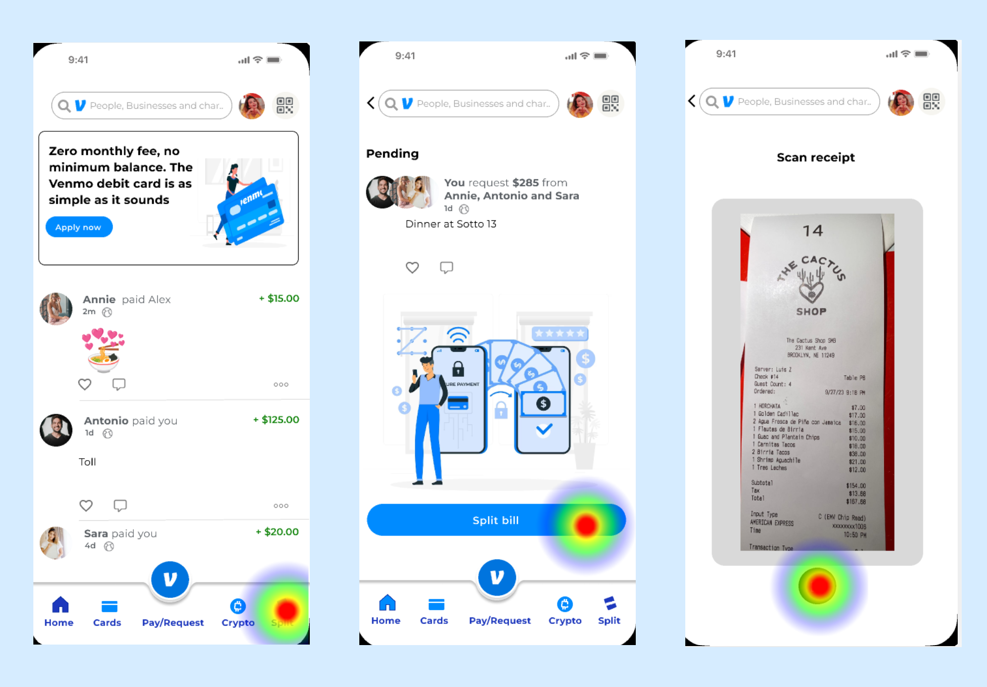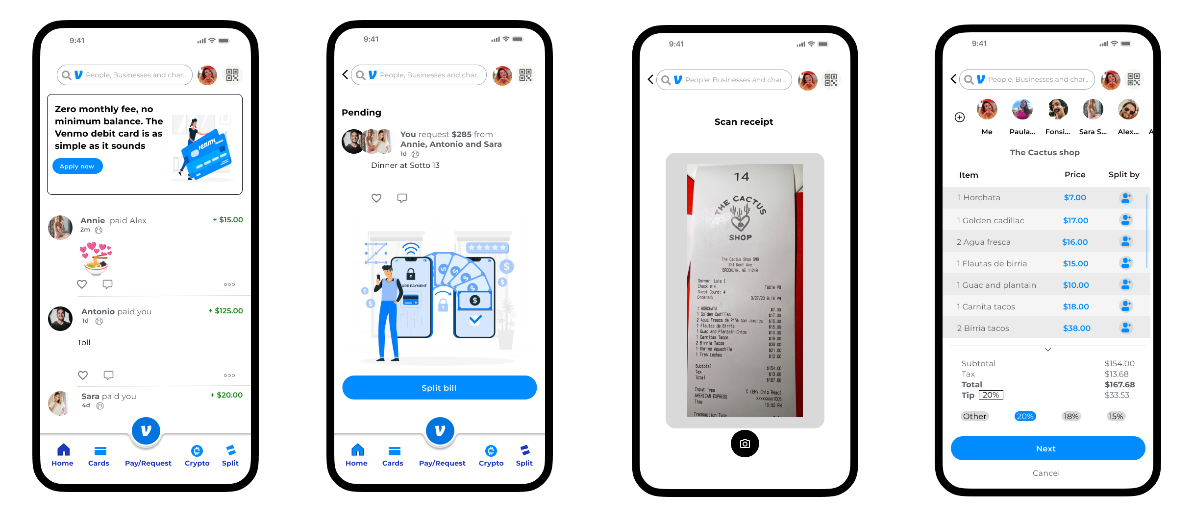 The process of splitting a bill starts with the addition of a “Split” button, strategically placed within the app’s interface. This button acts as a gateway, signaling the introduction of a new feature for customizable bill splitting. Once users click on the “Split” button, they are seamlessly directed to a “Scan the Receipt” screen. Here, users leverage the app’s scanning capabilities to capture a digital version of the physical bill, transforming it into a convenient and editable format. With the digital bill in hand, users are then guided to a customization screen where they can effortlessly tailor individual expenses, add or remove items, and adjust shares. Finally, users navigate through the intuitive interface to send a request to friends, utilizing the newly customized bill. This streamlined process aims to provide users with a comprehensive and user friendly experience, offering a seamless flow from initiating the bill split to customizing and requesting payments within the Venmo app.