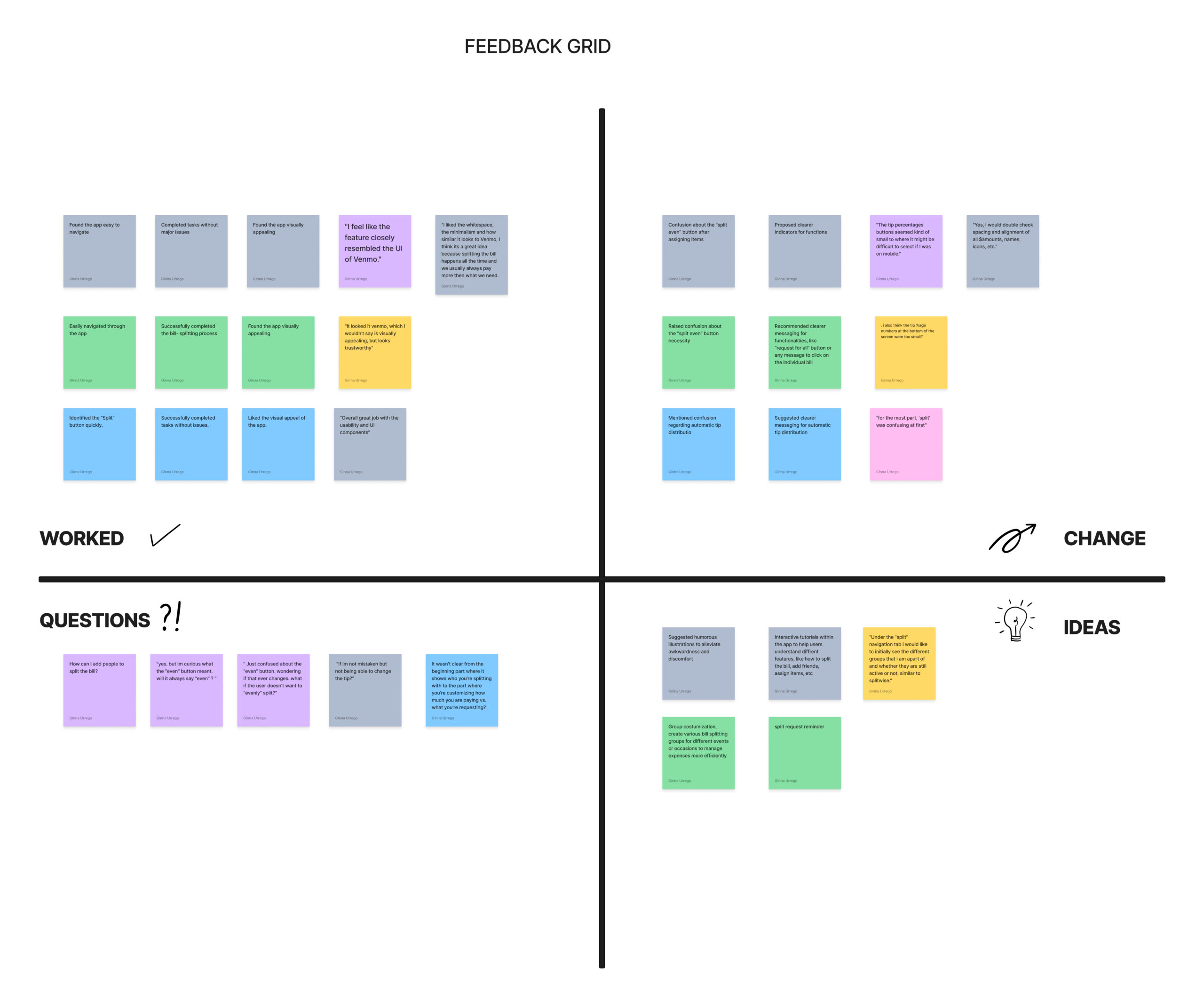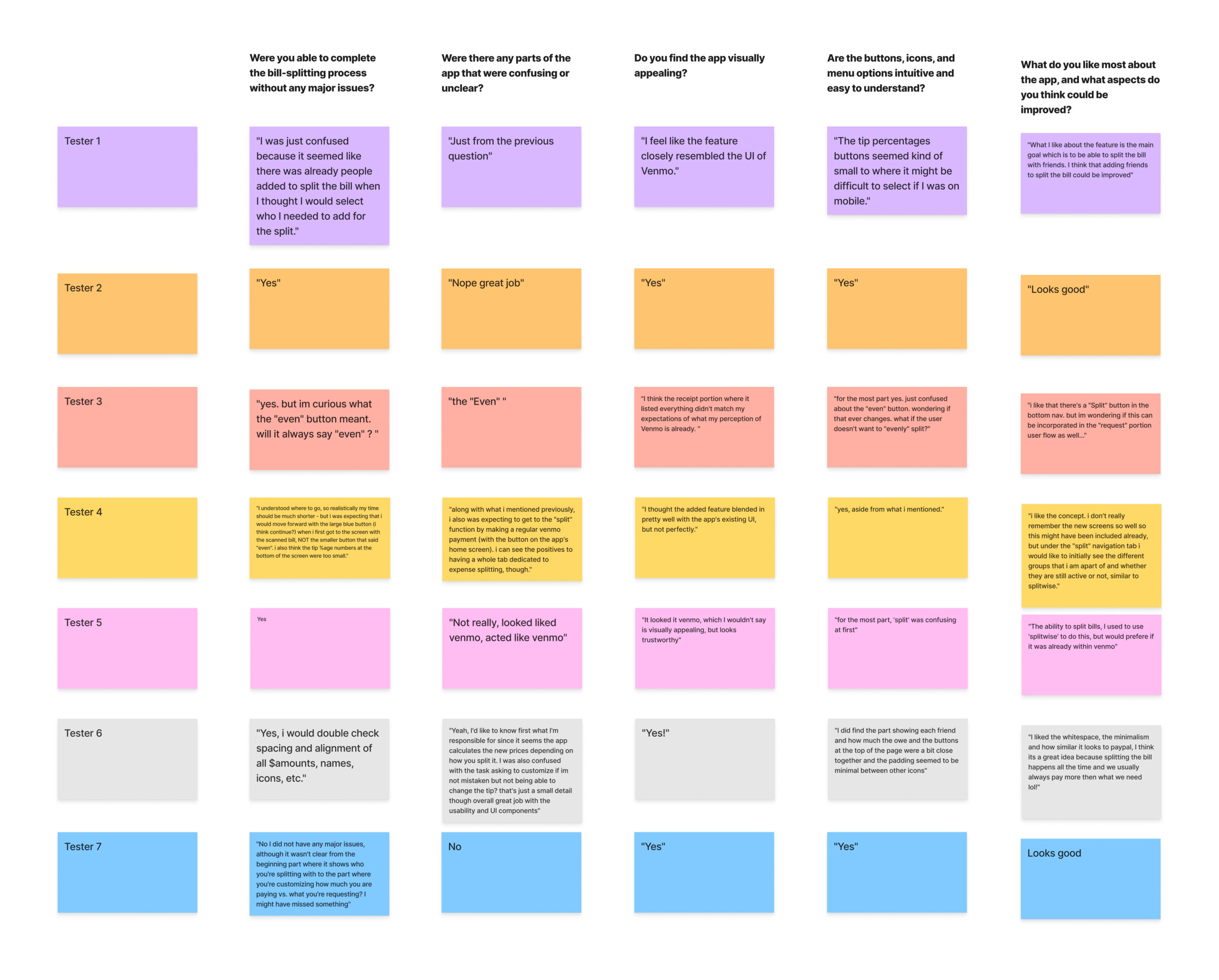 In synthesizing the research data, my focus was on identifying and addressing any usability issues encountered by users during the testing phase. The success criteria for this prototype centered around user willingness to adopt the new feature if incorporated into Venmo’s existing app. Encouragingly, 10 out of 14 users expressed their intent to use this feature, emphasizing its appeal as a swift and efficient solution for itemizing and splitting bills. This positive feedback underscores the prototype’s potential for enhancing the user experience within the Venmo platform.